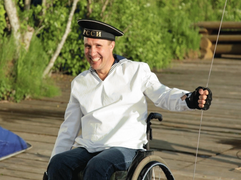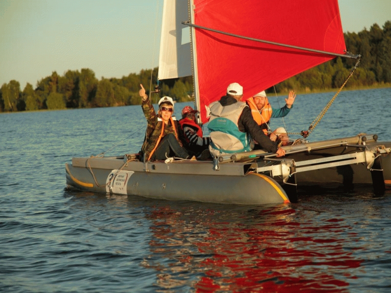 - Какие могут быть впечатления у колясочника оказавшийся внутри подлодки? Конечно самые сильные! Плюс возможность покататься внутри и посмотреть быт подводников. Пусть хоть и не многое пришлось увидеть, но побывать в 4-х отсеках это уже что-то! Оказывается, подлодка тоже ограниченно доступна колясочникам, - рассказывает Вячеслав Ушков из Новой Ладоги. Затем на автовокзале г. Вытегры состоялась долгожданная встреча с координатором проекта «Небо, открытое для всех» Сергеем Потехиным, с которым мы не выделись целый год. Сергей приехал специально из Москвы, чтобы принять участие в мероприятии. Вдруг раздался телефонный звонок – это председатель местной организации ВОИ из г.Тотьма Игорь Иванович Беседин из Интернета узнал о нашем мероприятии и выразил желание присоединиться к нам со своими единомышленниками – членами Вологодской организации ВОИ. Договорились о встрече на следующий день. К вечеру заселились в уютный Дом охотника кемпинга «ВытегориЯ» и почти сразу на берегу живописного Онежского озера новые знакомые из Москвы сотрудники ПАО «Вымпелком» Фалеев Алексей, Курбатов Константини Баскаков Юрий провели для наших ребят мастер-класс по управлению парусным катамараном, рассказали о своих походах и достижениях. Наши в свою очередь поделились своими планами на это лето. Увидев блеск в глазах ребят, экипаж катамарана предложил отправиться всем вместе на косу – живописный берег Онежского озера, заодно и отработать знания, полученные на берегу, в деле. Желающих и прыгающих от восторга оказалось больше, чем мест на катамаране – поэтому было решено взять еще надувную лодку и отправиться любоваться закатом.