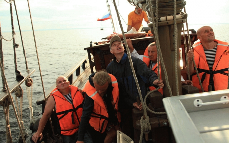 5 августа наш корабль по просьбе организаторов уже ждали в старинном заонежском селе Великая Губа, где состоялась также традиционная Великогубская регата на традиционных лодках-кижанках, где принял успешное участие и экипаж представителей ВОИ-РССИ в составе Красильникова Олега из Кондопоги и Зверьковой Елены из Москвы. Далее нас ждал не простой переход по Кижским шхерам и по Повенецкой Губе Онежского озера до п. Повенец и переход по шлюзам Беломорканала до выхода в Белое море. Участники перехода имели возможность на практике осваивать премудрости морской науки, управлять кораблем, ставить паруса, шлюзоваться, поддерживать порядок на корабле. Сотрудники Беломорканала показали удивительно четкую и слаженную работу при проводке нашего судна по каналу. С особым чувством волнения мы ждали момент прохождения 19-го шлюза и выхода нашего судна с флагами ВОИ и РССИ в Белое море. Высшие силы были благосклонны к нашему появлению и мы получили возможность полюбоваться бескрайними морскими просторами Белого моря в довольно спокойных погодных условиях. Переход до Соловецких островов занял 9 часов и появление знаменитого Соловецкого собора все члены экипажа встречали на палубе. Нас ждали интереснейшие экскурсии по памятникам истории и культуры на островах архипелага, неожиданные встречи с новыми друзьями. Одной из самых ярких встреч, стала импровизированная встреча на нашем корабле с автором песни "На Соловецких Островах" Вихаревым Валентином Ивановичем