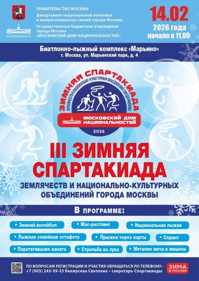 14 февраля 2026 года на современной трассе биатлонно-лыжного комплекса «Марьино» состоится III Зимняя Спартакиада землячеств и национально-культурных объединений Москвы.